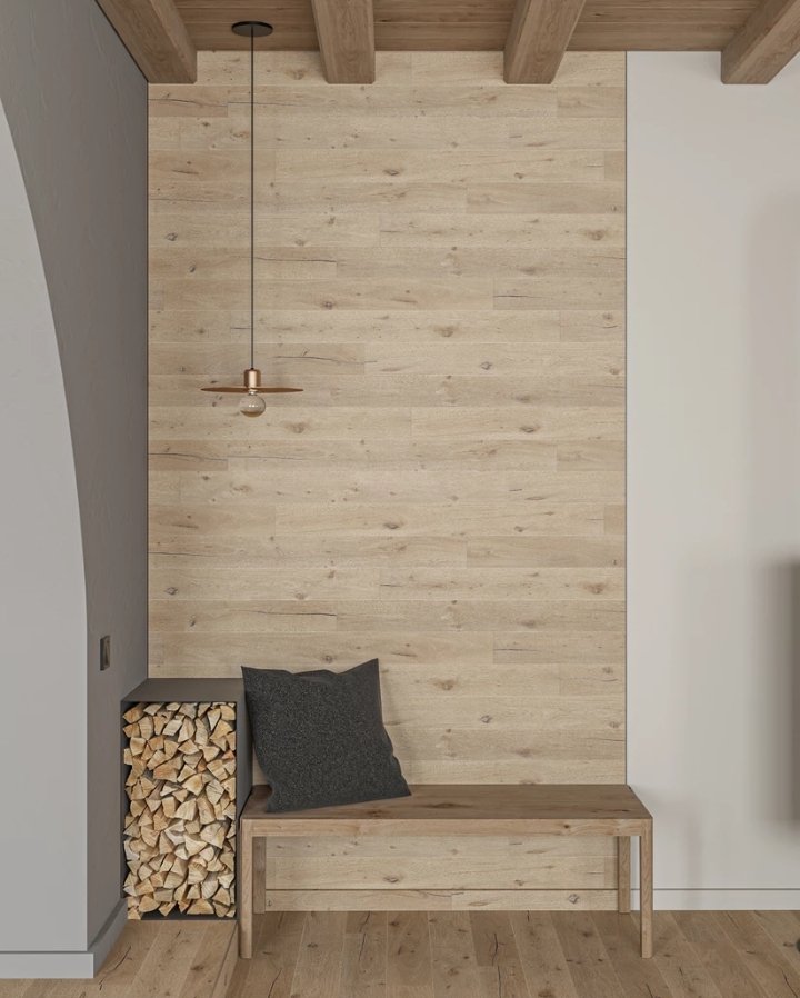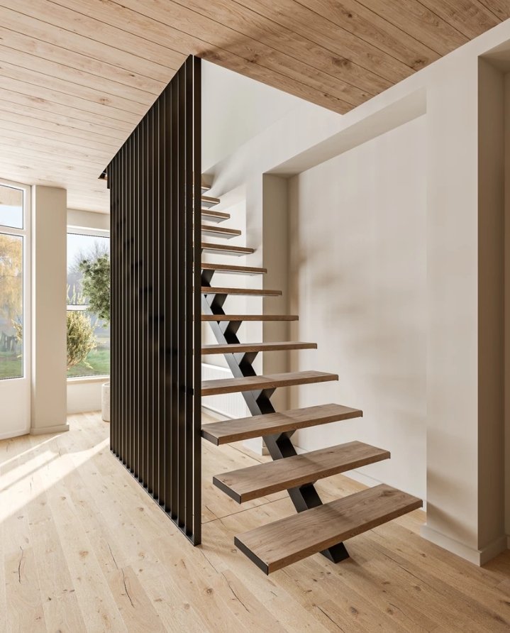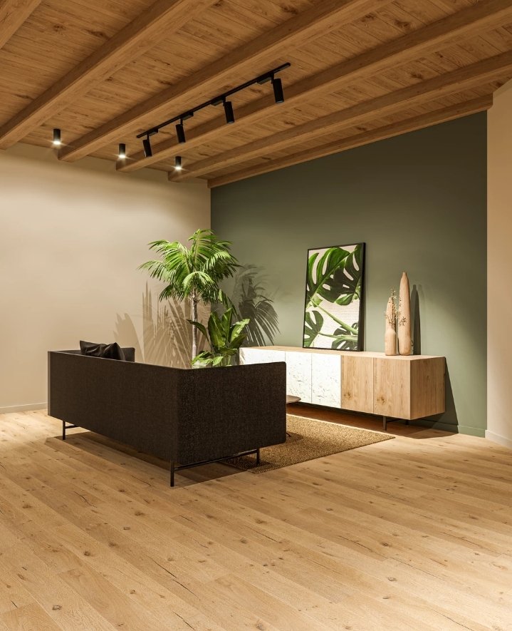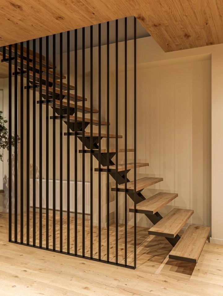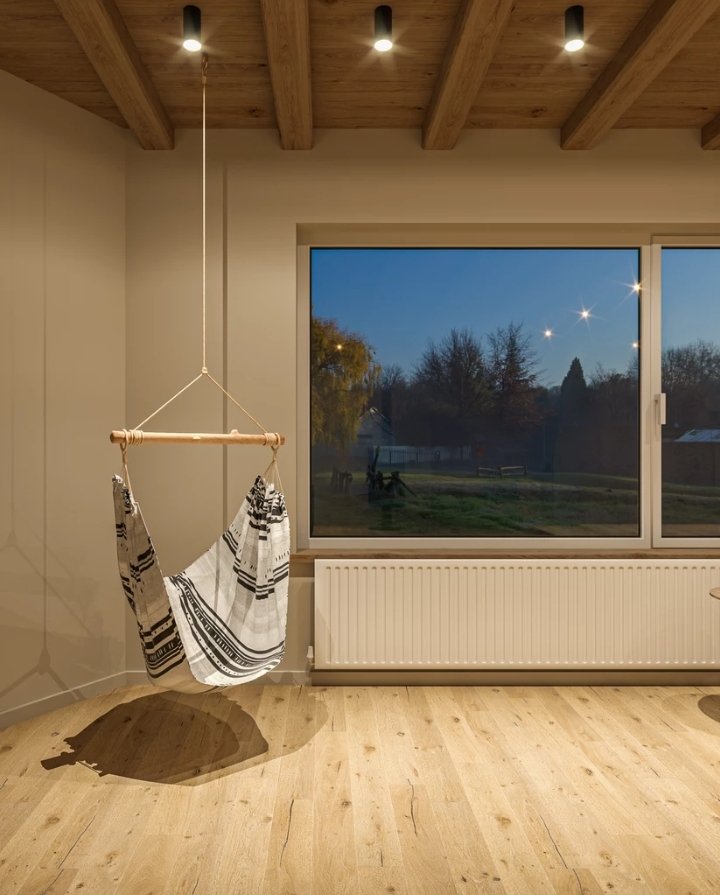 În ceea ce privește tavanul, acesta a fost decorat utilizând grinzi de brad, tratate astfel încât să capete o nuanță caldă și un aspect uniform, varianta inițială fiind compusă din rigips cu spoturi încorporate. Un alt punct de atracție este dat de scara cu aspect minimalist și structură metalică, susținerea treptelor fiind realizată cu ajutorul unei grinzi. În centrul tuturor acestor elemente de design se regăsește amplasată o sobă cu lemne, cu un aer rustic și tradițional, dar cu o interfață modernă, achiziționată de pe site-ul Pefoc.ro. Astfel, aceasta reprezintă elementul de bază care unește inovația elementelor minimaliste cu rusticul dat de influențele tropicale.