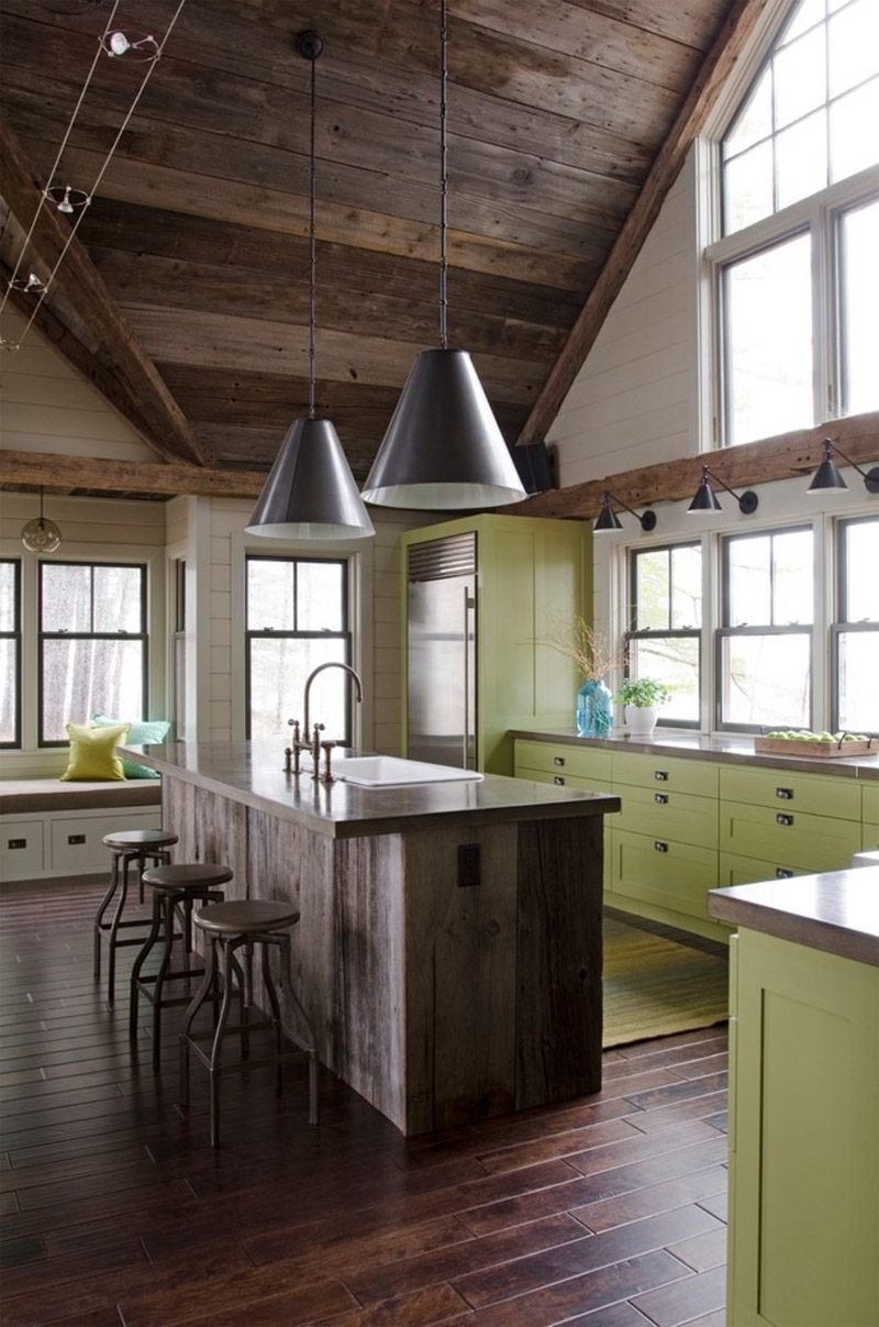 Dulapurile uzate din lemn fac dintr-o bucătărie un spațiu pur și simplu unic. Aspectul robust este amplificat de scaunee de oțel și dulapuri luminoase de verde crud. Ca mărul verde. Lambriurile albe ajută, de asemenea, la crearea unui contrast absolut deosebit și de mare calitate.