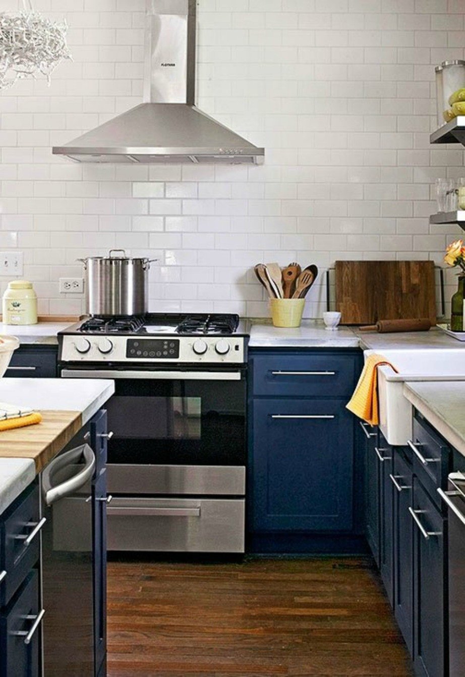 Podelele din lemn masiv dau unei bucătării o calitate robustă dar opusă accesoriilor care vor alcătui restul camerei. Schepsisul constă în gresia și blaturile albe în deplin contrast cu dulapurile de un albastru puternic. Oțelul accesoriilor conferă valoare camerei. Un candelabru abstract va adăuga un plus de eleganță.