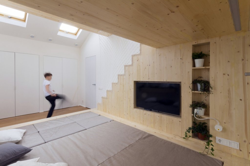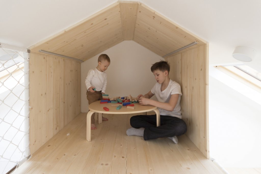 Au amenajat-o ca un imens spațiu de joacă, structurat pe două nivele. Cu toate că este un spațiu deschis, cu dormitorul familiei la parter și mansarda destinată copiilor, căsuța oferă intimitate și funcționalitate.