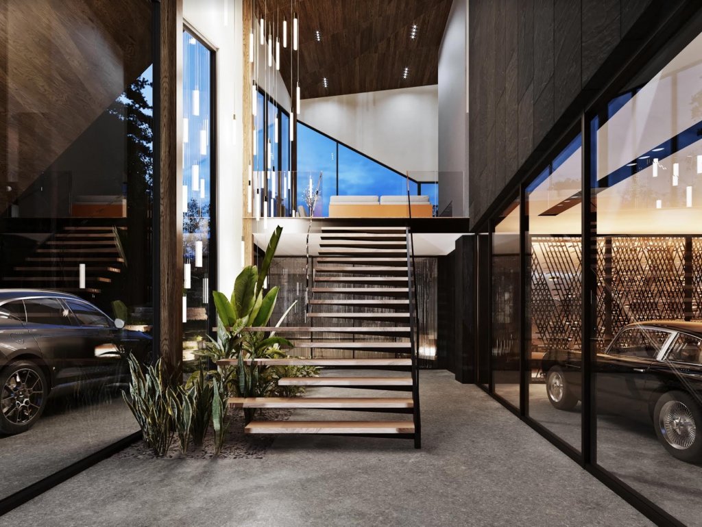 Ca să ajungi la intrarea principală a vilei, înainte de toate, trebuie să străbați o alee de care se întinde pe mai bine de 600 de metri. Mai există o intrare, care parcă este tăiată direct în acoperiș, și pe acolo se intră în… garajul-expoziție. Aici, sub pământ, și parcă săpat direct în stâncă, găsești trei locuri de parcare, generoase, care adăpostesc trei superbolizi Aston Martin. Dacă nu s-ar găsi aici și o cramă, ai putea să crezi că ești într-un minimuzeu al firmei auto. Mașinile stau cu boturile orientate înspre un panou pentru sticle de vin format din zabrele dispuse într-o formă ce amintește de sigla constructorului auto. Tot la acest nivel se mai găsește și un birou, la fel de luxos și de ”in-nature”. La parter, mai există o bucătărie, o zona de luat masa, un lounge, ceva băi, dar și alte spații comune, cele mai multe cu vedere spre piscine și spre bucătăria ”de vară”. La etaj se va află dormitorul principal, ceva absolut superb.