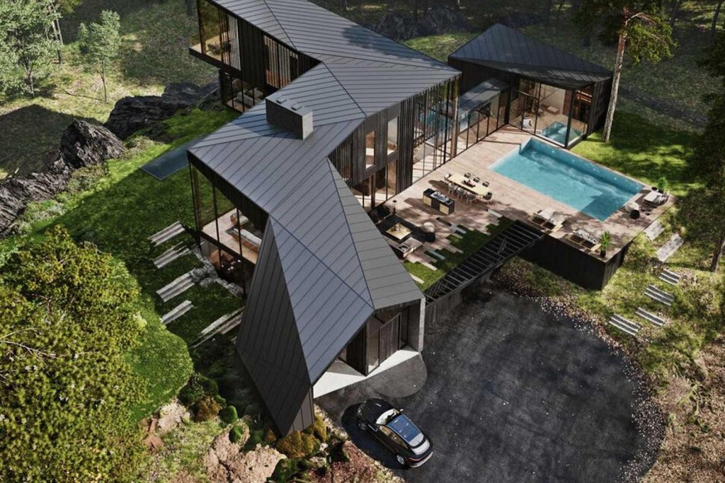 Văzută de sus, vila pare să imite formațiunile stâncoase din apropiere, și, ca să fie cât mai natural, acoperișul este făcut din lemn de cedru afumat. Evident, toți pereții sunt de sticlă, în așa fel, încât, indiferent unde te-ai afla, în dormitorul principal, în bucătărie sau în sufragerie, ai senzația că trăiești fix în pădure. De altfel, scopul unui astfel de locuințe este acela ca proprietarii să se “reconecteze la natură”.