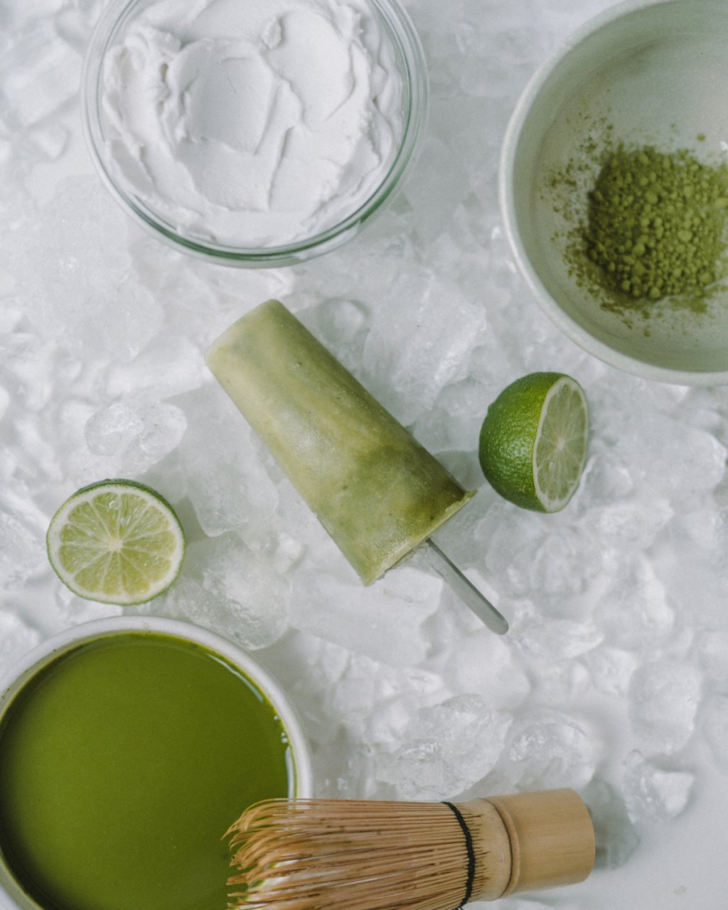 Etape: amestecați matcha cu puțină apă până are consistența unei smântăni. Adaugați în laptele de cocos mierea, zeama și coaja de lime, uniformizând. Puneți matcha în formele de înghețată, și completați cu amestecul de lapte de cocos. Lăsați compoziția în congelator pentru minim 4 ore, de preferat întreagă noapte.