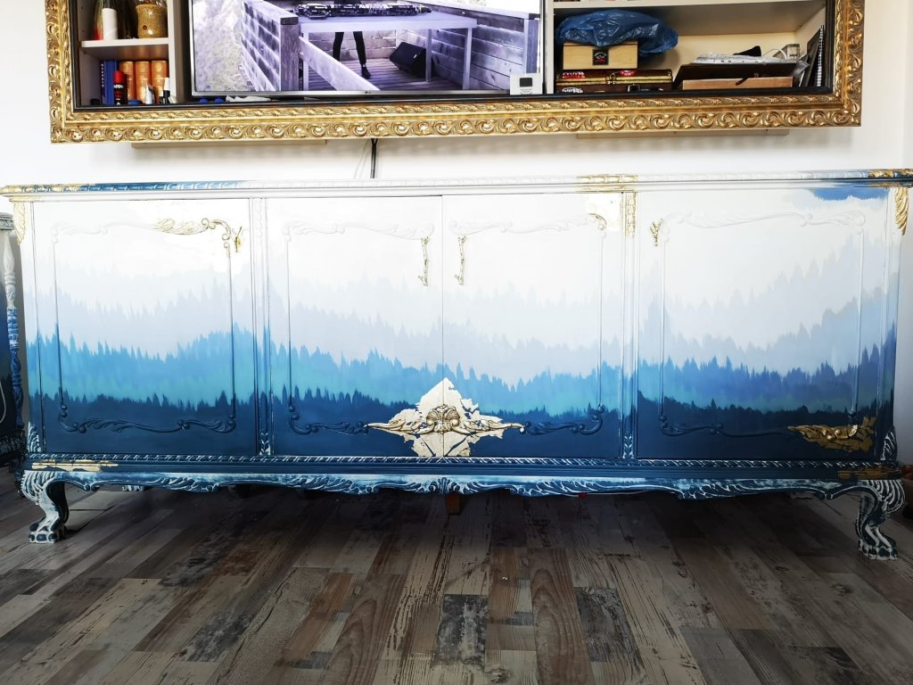 După care fiecare secțiune a fost vopsită într-o nuanță diferită de vopsea până se obține acest efect degrade. Apoi a stropit ușor cu apă zonele proaspăt vopsite și cu mișcări ușoare de pensula, de sus în jos, se amestecă culorile astfel să se obțină un efect de blenduire în degrade. Se repetă procedul de jur împrejur și în zona blatului.