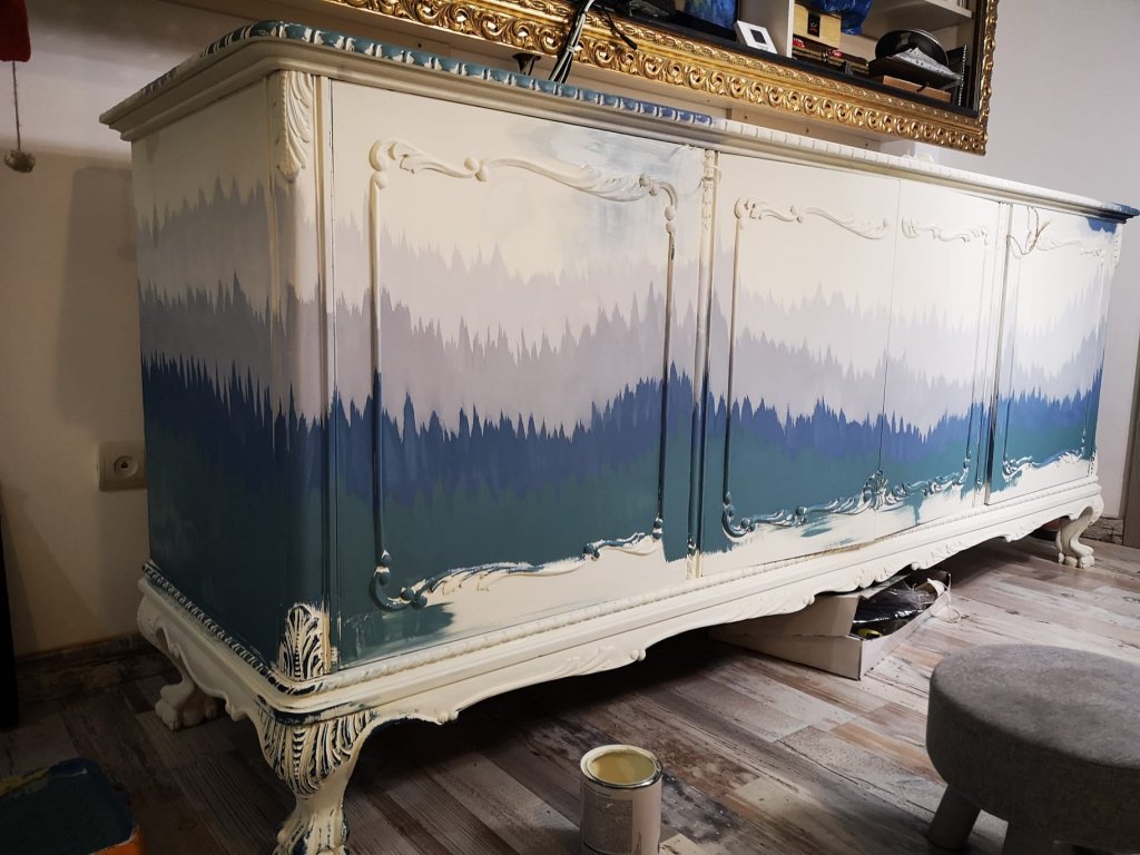 Dulapurile sunt perfecte pentru aplicarea acestei tehnici datorită suparfetei plane fără prea multe curbe sau detalii. Suprafață plană face ușoară amestecarea culorilor. Pentru început Ciprian a aplicat pe suprafața întregului dulap două straturi de vopsea cretata albă, apoi a împărțit suprafața dulapului în patru secțiuni orizontale, fiecare pentru o nuanță de culoare și la fel a procedat și cu blatul dulapului.