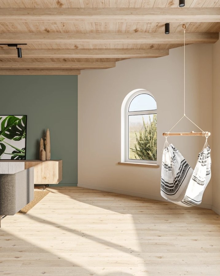 În ceea ce privește tavanul, acesta a fost decorat utilizând grinzi de brad, tratate astfel încât să capete o nuanță caldă și un aspect uniform, varianta inițială fiind compusă din rigips cu spoturi încorporate. Un alt punct de atracție este dat de scara cu aspect minimalist și structură metalică, susținerea treptelor fiind realizată cu ajutorul unei grinzi. În centrul tuturor acestor elemente de design se regăsește amplasată o sobă cu lemne, cu un aer rustic și tradițional, dar cu o interfață modernă, achiziționată de pe site-ul Pefoc.ro. Astfel, aceasta reprezintă elementul de bază care unește inovația elementelor minimaliste cu rusticul dat de influențele tropicale.