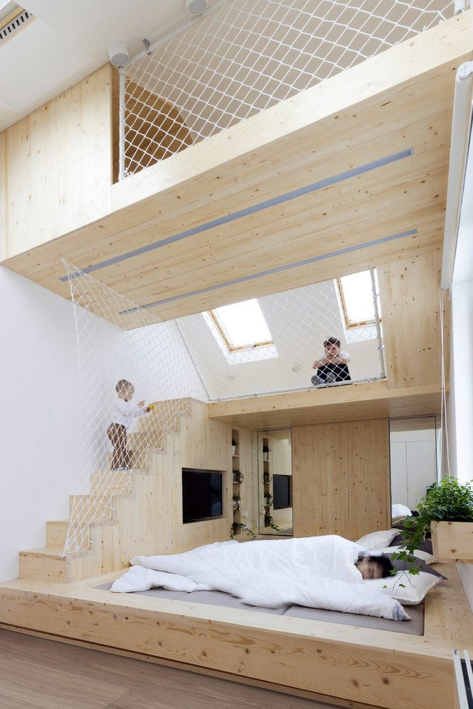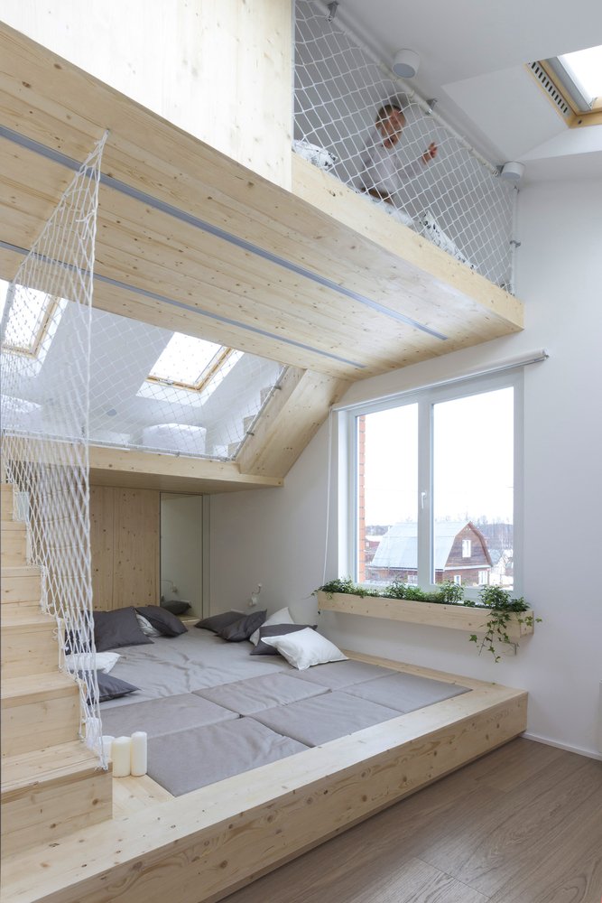 Au amenajat-o ca un imens spațiu de joacă, structurat pe două nivele. Cu toate că este un spațiu deschis, cu dormitorul familiei la parter și mansarda destinată copiilor, căsuța oferă intimitate și funcționalitate.