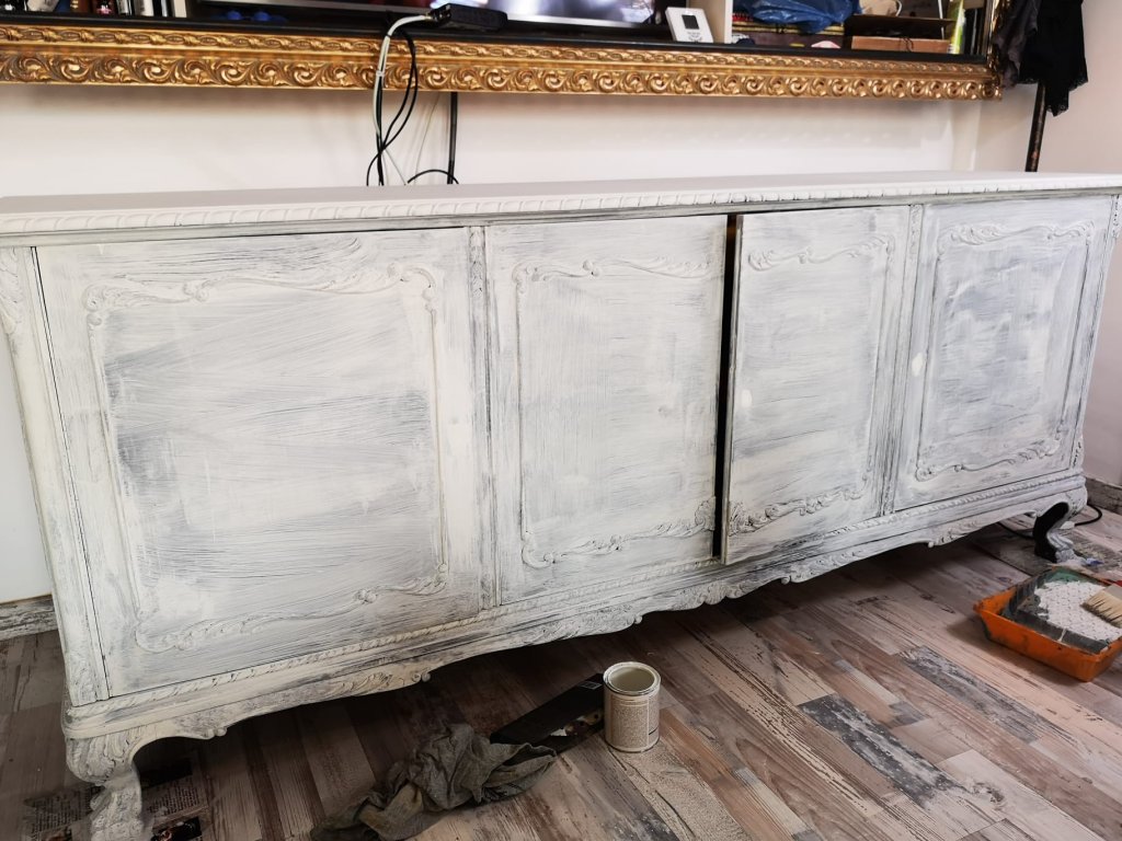 Dulapurile sunt perfecte pentru aplicarea acestei tehnici datorită suparfetei plane fără prea multe curbe sau detalii. Suprafață plană face ușoară amestecarea culorilor. Pentru început Ciprian a aplicat pe suprafața întregului dulap două straturi de vopsea cretata albă, apoi a împărțit suprafața dulapului în patru secțiuni orizontale, fiecare pentru o nuanță de culoare și la fel a procedat și cu blatul dulapului.