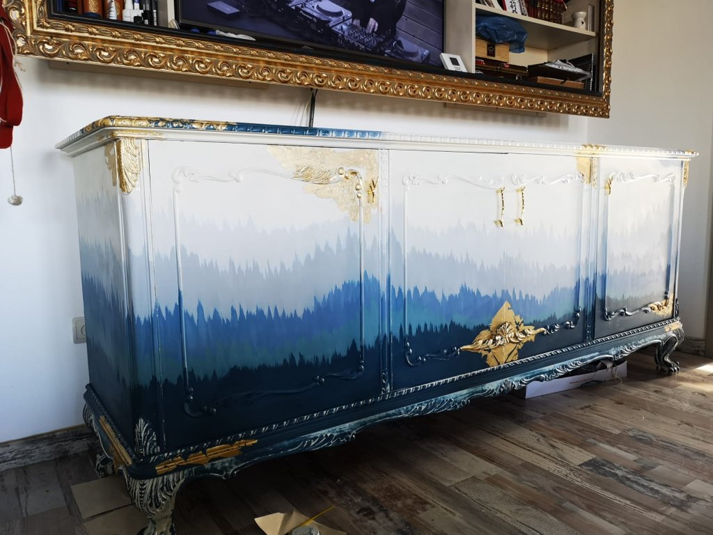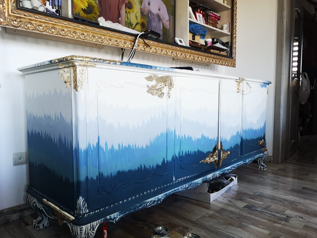 După care fiecare secțiune a fost vopsită într-o nuanță diferită de vopsea până se obține acest efect degrade. Apoi a stropit ușor cu apă zonele proaspăt vopsite și cu mișcări ușoare de pensula, de sus în jos, se amestecă culorile astfel să se obțină un efect de blenduire în degrade. Se repetă procedul de jur împrejur și în zona blatului.