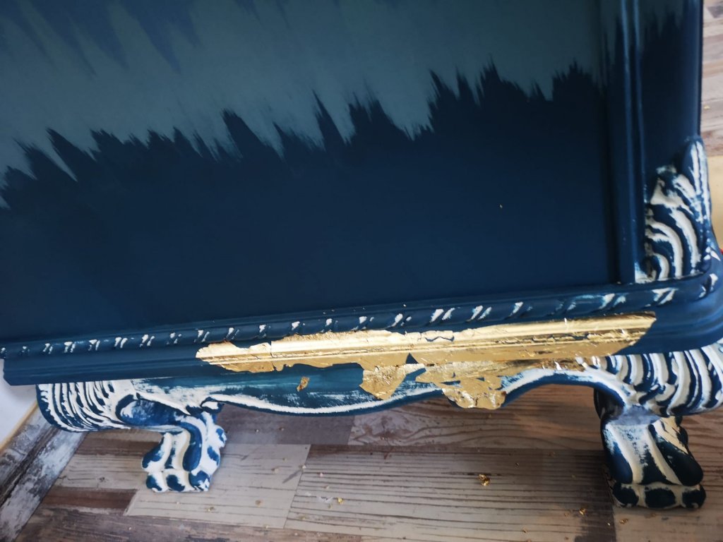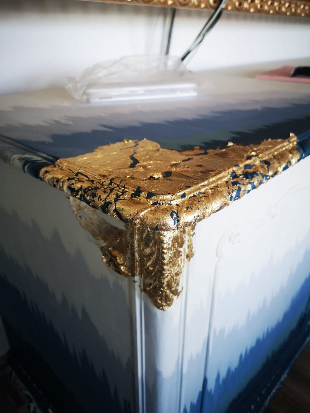 Materiale: 2 cuti de vopsea alb powder cretata (800 ml), diversi pigmenti pentru vopsea lavabila, lac finish pentru vopsea alba, diverse tipuri de pensule pentru vopsea, foițe de aur ( toate materialele se găsesc în magazinele de bricolaj)