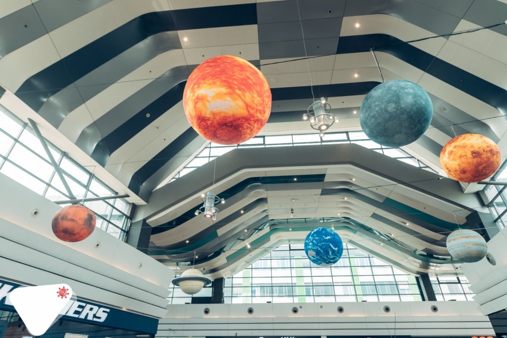 Cel mai mare satelit din sistemul solar, Luna, cu un diametru de 5 metri, se găsește într-o formă 3D supradimensionată, la etajul 1, în zona restaurantelor.